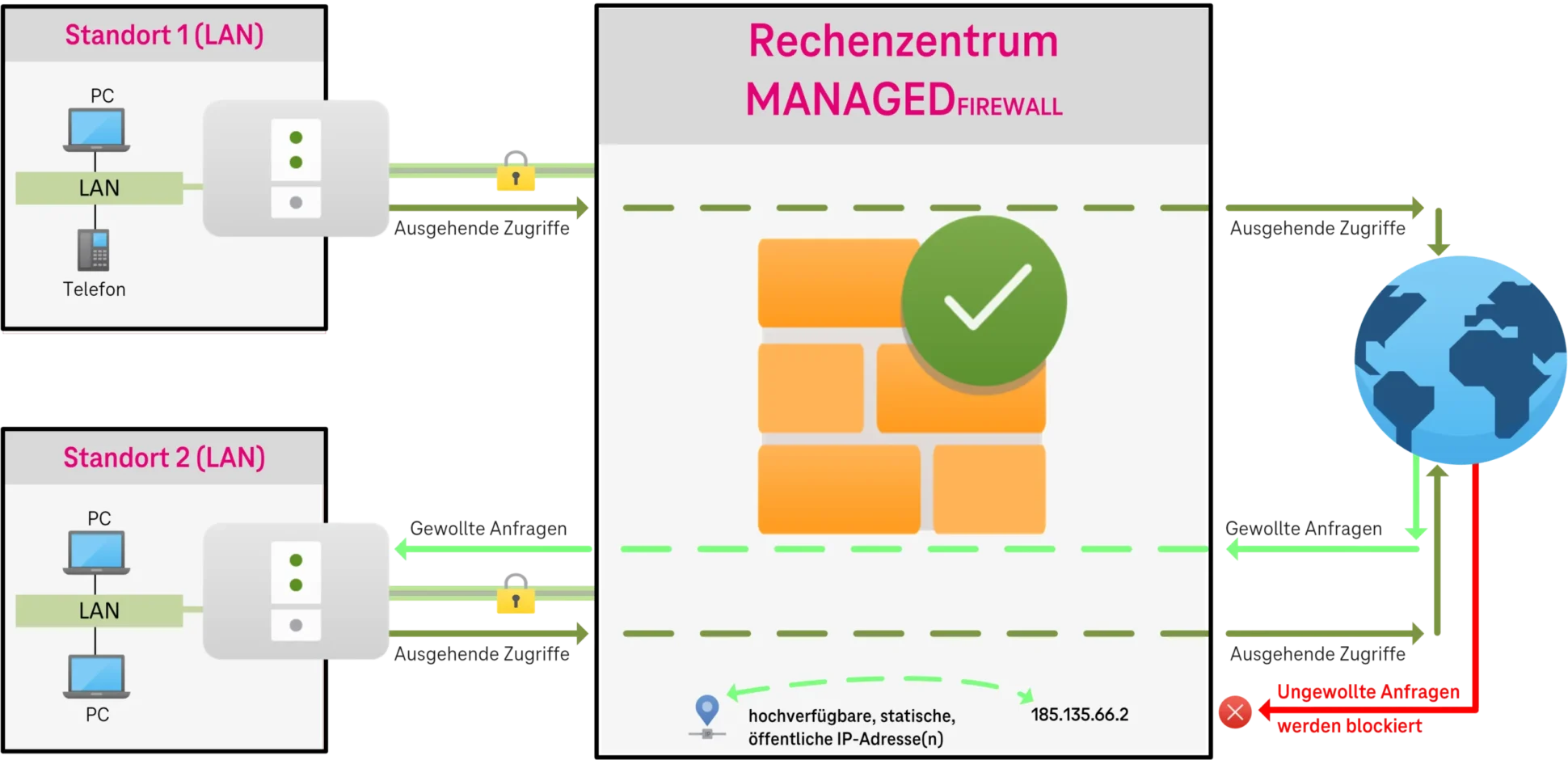 Eine Firewall ist die zentrale Komponente eines effektiven IT-Sicherheitskonzepts. Sie schützt Ihre sensiblen Firmendaten vor unbefugtem Zugriff von außen und bewahrt das Vertrauen Ihrer Kunden. Ähnlich einer Zugbrücke bei einer Burg erlaubt die Firewall den Zugang zu Ihrem Firmennetzwerk nur an definierten Stellen. Dadurch wird der gesamte Datenverkehr, der über die Firewall läuft, kontrollierbar, und potenzielle Einfallstore können geschlossen werden. Diese Sicherheitsaspekte setzt TRUSTEDACCESS MANAGEDFIREWALL konsequent um. Nur der in den Sicherheitseinstellungen freigegebene Datenverkehr wird zugelassen.